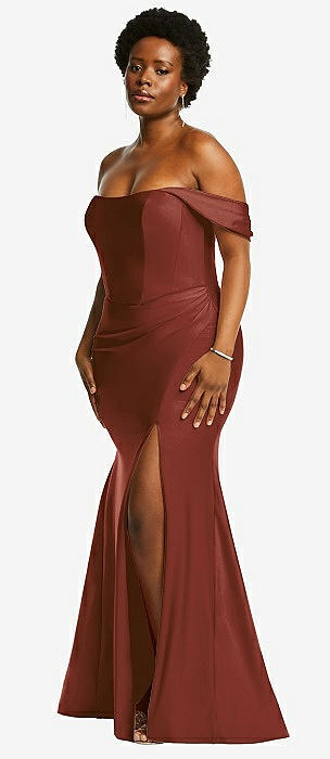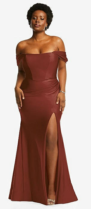 Off-the-Shoulder Corset Stretch Satin Mermaid Dress with Slight Train in auburn moon