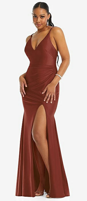 Deep V-Neck Stretch Satin Mermaid Dress with Slight Train in auburn moon