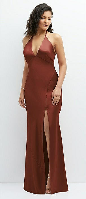 Plunge Halter Open-Back Maxi Bias Dress with Low Tie Back in auburn moon