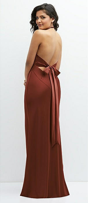 Criss Cross Halter Open-Back Stretch Satin Mermaid Dress in auburn moon