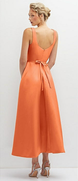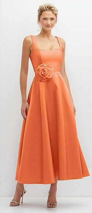 Square Neck Satin Midi Dress with Full Skirt & Flower Sash in portofino orange