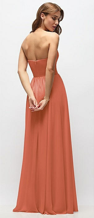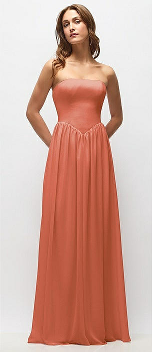 Strapless Basque Drop Waist Chiffon Maxi Dress with Shirred Skirt in terracotta copper