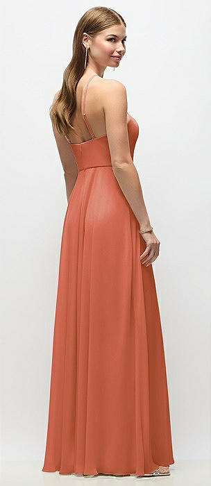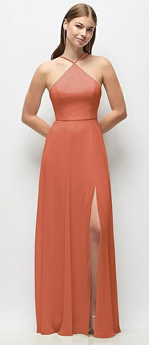 High-Neck Halter Chiffon Maxi Dress with Adjustable Spaghetti Straps in terracotta copper