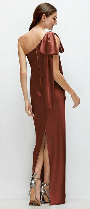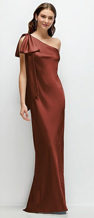One-Shoulder Bias-Cut Satin Maxi Dress with Cascading Shoulder Bow in auburn moon