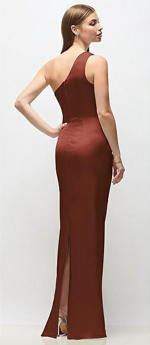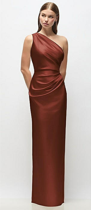 One-Shoulder Draped Bodice Stretch Satin Column Maxi Dress in auburn moon