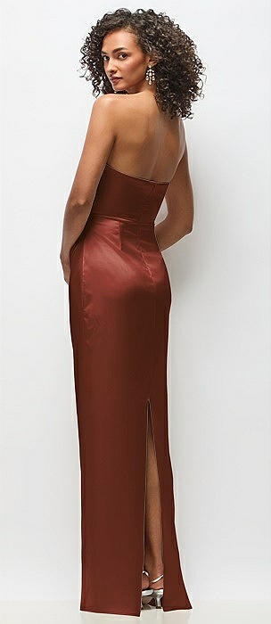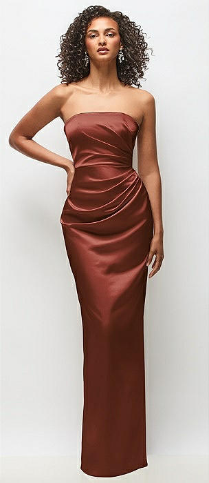 Strapless Draped Bodice Stretch Satin Column Maxi Dress in auburn moon