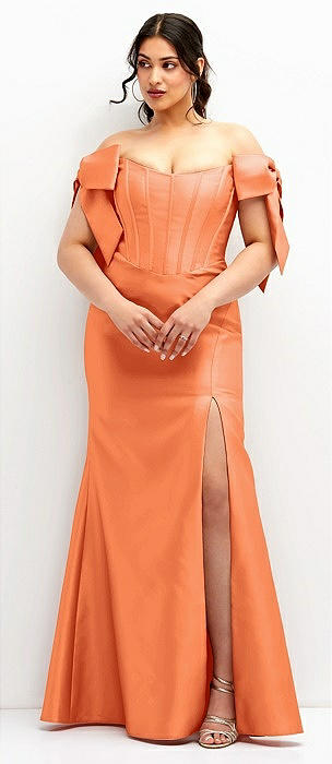 Off-the-Shoulder Bow Satin Corset Dress with Fit and Flare Skirt in portofino orange