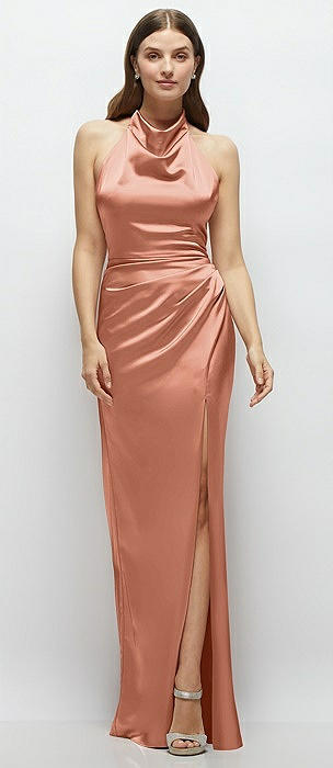 Cowl Halter Open-Back Satin Maxi Dress in copper penny