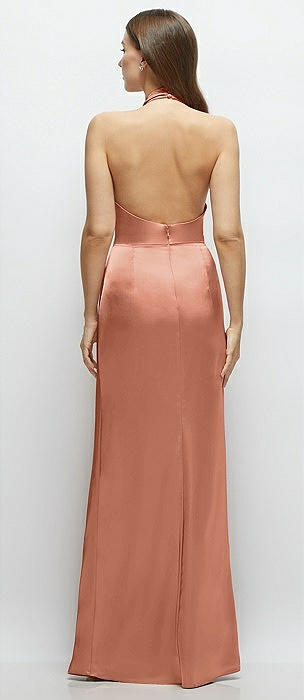 High Halter Tie-Strap Open-Back Satin Maxi Dress in copper penny