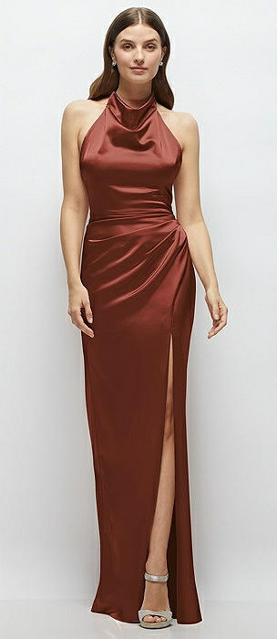Cowl Halter Open-Back Satin Maxi Dress in auburn moon