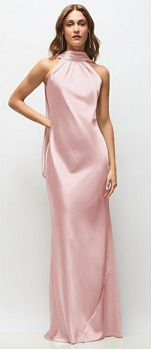 Draped Scarf Halter Open-Back Stretch Satin Bias Maxi Dress with Adjustable Straps