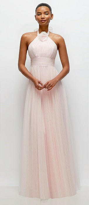 Tie-Back Halter Tulle Maxi Dress with Full Skirt & Rosette Detail in ballet pink