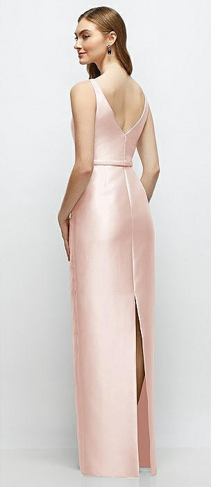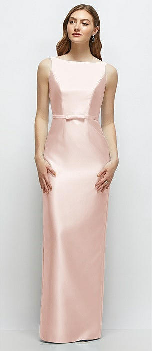Bateau Neck Satin Column Dress with Bow-Trimmed Skinny Belt in blush