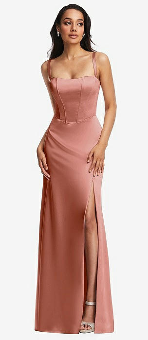 Lace Up Tie-Back Corset Maxi Dress with Front Slit in desert rose