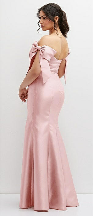 Off-the-Shoulder Bow Satin Corset Dress with Fit and Flare Skirt in ballet pink