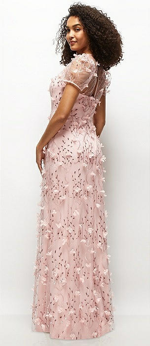 3D Floral Embroidered Puff Sleeve A-line Maxi Dress with Petal-Adorned Illusion Neckline in rose