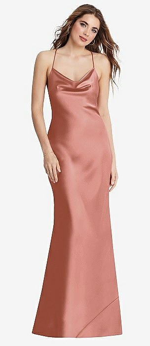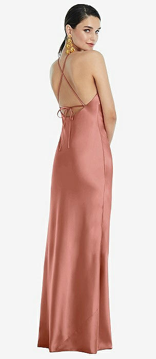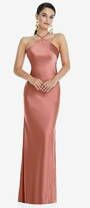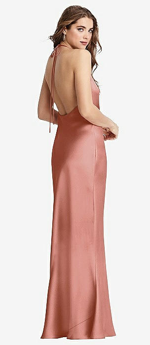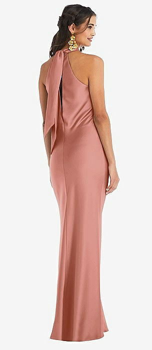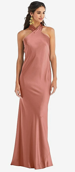 Draped Twist Halter Tie-Back Trumpet Gown in desert rose