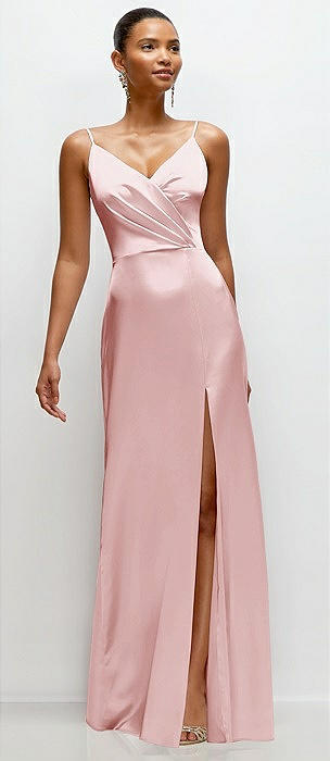 Pleated Faux Wrap Satin Maxi Dress with Adjustable Spaghetti Straps in ballet pink