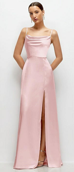 Cowl Neck Satin Maxi Dress with Adjustable Spaghetti Straps in ballet pink