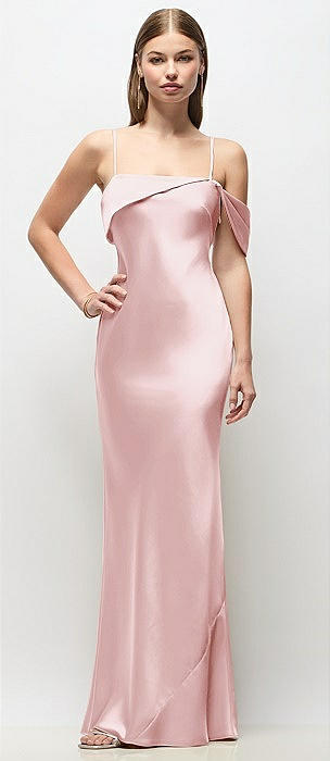 Asymmetrical Cuff Neck Stretch Satin Bias Maxi Dress with Adjustable Spaghetti Straps in ballet pink