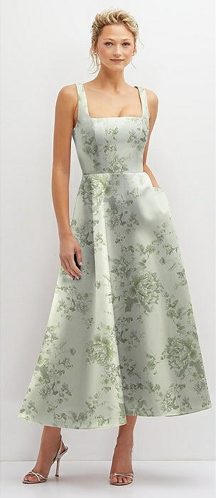 Floral Square Neck Satin Midi Dress with Full Skirt & Pockets in sage cottage rose