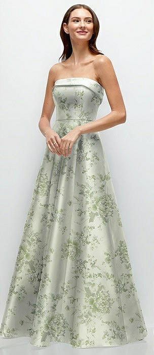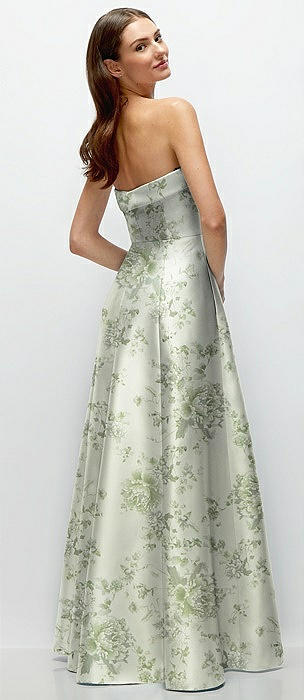 Strapless Bias Cuff Bodice Floral Satin Gown with Pockets in sage cottage rose