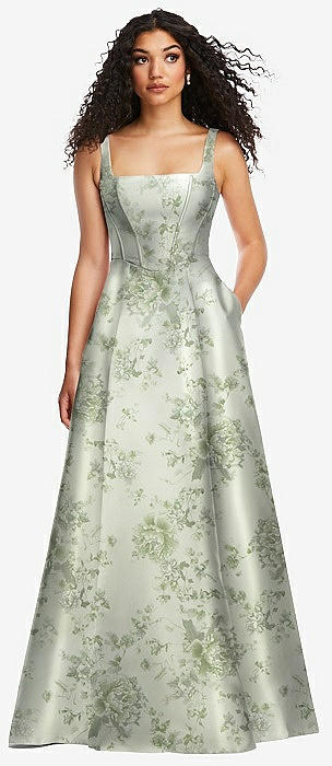 Boned Corset Closed-Back Floral Satin Gown with Full Skirt in sage cottage rose