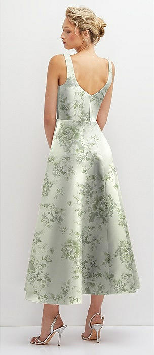 Floral Square Neck Satin Midi Dress with Full Skirt & Pockets in sage cottage rose