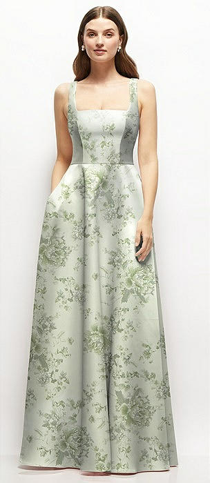 Floral Square-Neck Satin Maxi Dress with Full Skirt in sage cottage rose