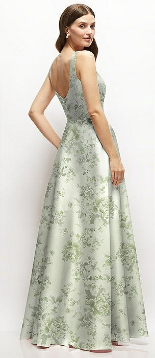 Floral Lace-Up Back Bustier Satin Dress with Full Skirt and Pockets in sage cottage rose
