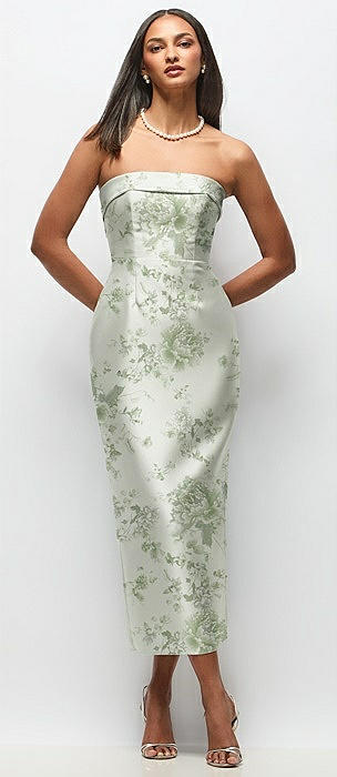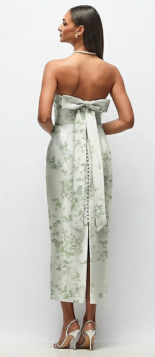 Strapless Cuff Floral Satin Midi Dress with Column Skirt & Back Bow in sage cottage rose
