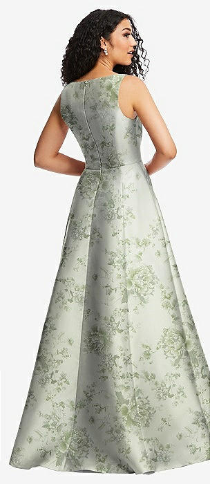 Boned Corset Closed-Back Floral Satin Gown with Full Skirt in sage cottage rose