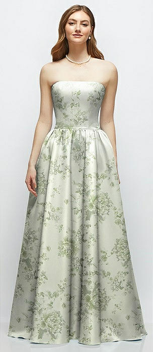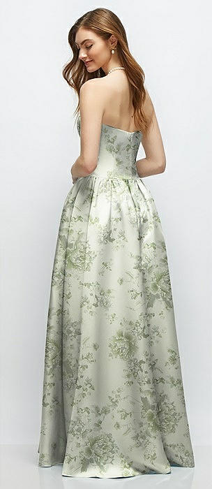 Floral Strapless Satin Drop Waist Gown with Full Skirt in sage cottage rose