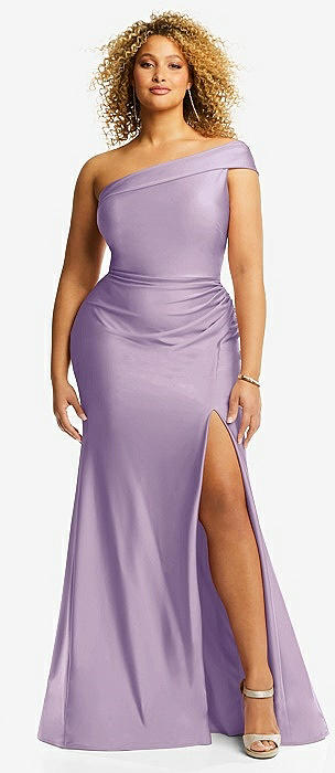 Draped One-Shoulder Satin Trumpet Gown with Front Slit in lilac haze