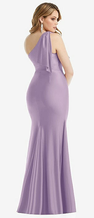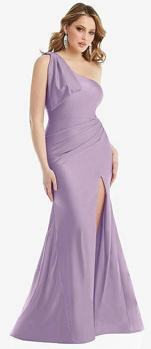 Cascading Bow One-Shoulder Stretch Satin Mermaid Dress with Slight Train in pale purple