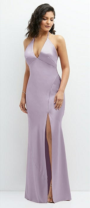 Plunge Halter Open-Back Maxi Bias Dress with Low Tie Back in lilac haze