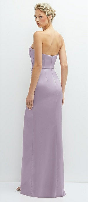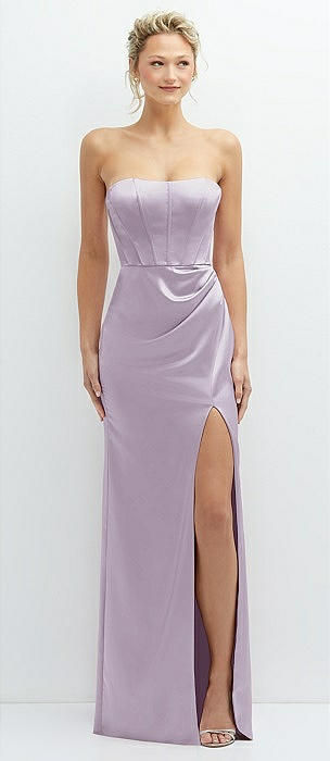 Strapless Topstitched Corset Satin Maxi Dress with Draped Column Skirt in lilac haze