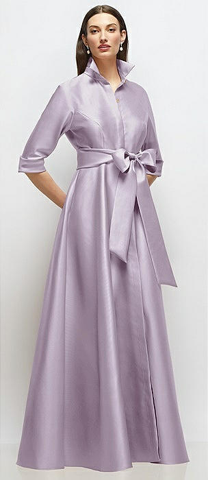 3/4 Sleeve Satin Shirt Dress Gown with Sash and Jeweled Buttons in lilac haze