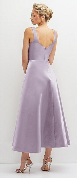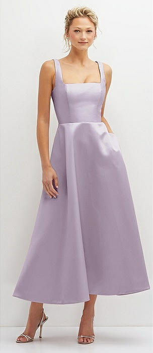Square Neck Satin Midi Dress with Full Skirt & Pockets in lilac haze