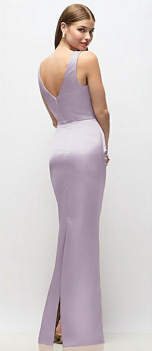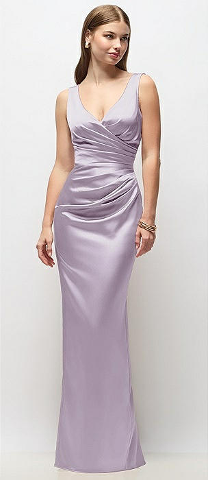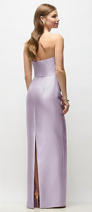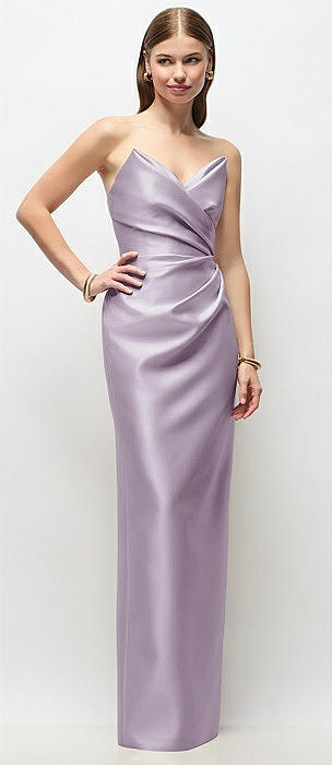 Strapless Asymmetrical Draped Satin Column Maxi Dress in lilac haze