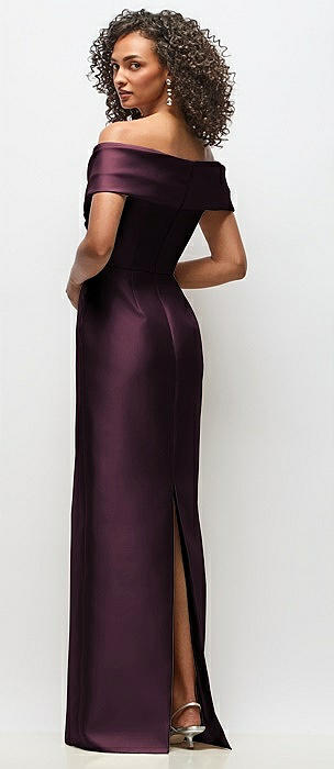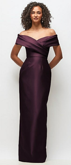 Draped Wrap Off-the-Shoulder Satin Column Floral Maxi Dress in deep plum
