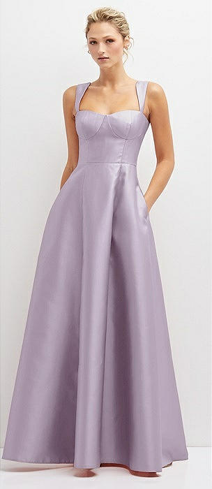 Boned Corset Closed-Back Satin Gown with Full Skirt and Pockets in lilac haze