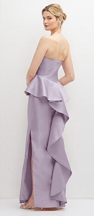 Strapless Satin Maxi Dress with Cascade Ruffle Peplum Detail in lilac haze