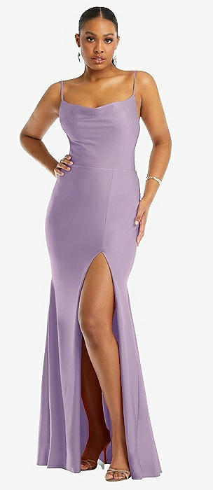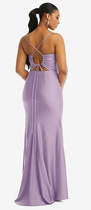 Cowl-Neck Open Tie-Back Stretch Satin Mermaid Dress with Slight Train in pale purple