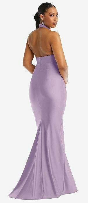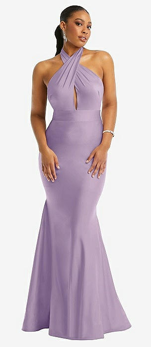 Criss Cross Halter Open-Back Stretch Satin Mermaid Dress in pale purple