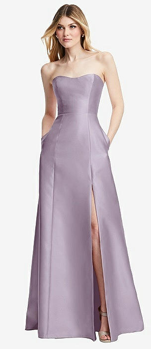 Strapless Bias Cuff Bodice Satin Gown with Pockets in lilac haze