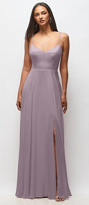 Spaghetti Strap Draped Skirt Gown with Front Slit in lilac dusk