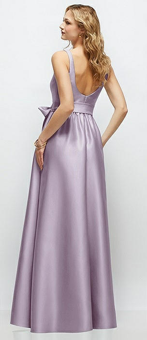 Square Neck Satin Midi Dress with Full Skirt & Flower Sash in lilac haze