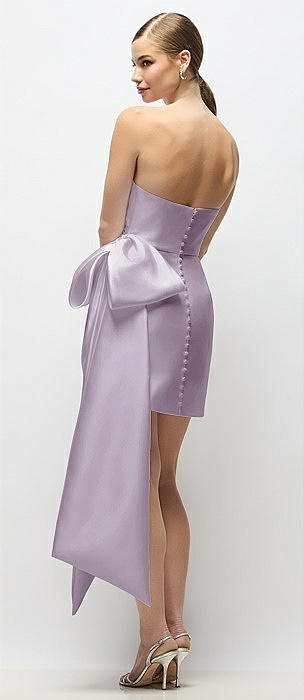 Strapless Pleated Draped Satin Mini Dress with Dramatic Long Tail Bow & Covered Buttons