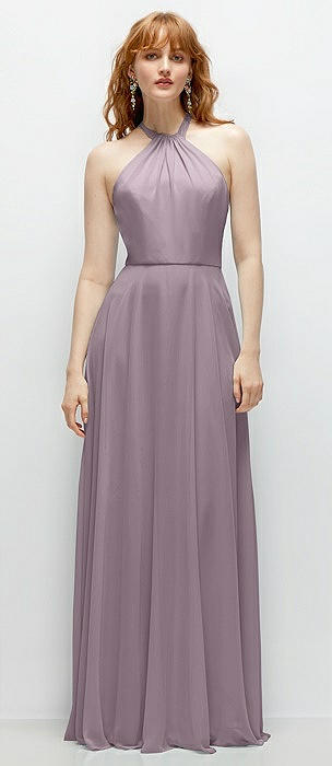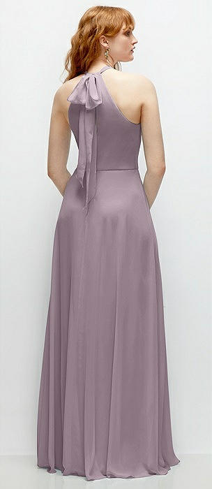 Shirred Halter Chiffon Maxi Dress with Back Sash-Tie Closure in lilac dusk